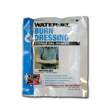 Gel-soaked burn dressings. This is a non-woven, non-adherent dressing that contains no active ingredients or drugs and is latex free. It cools the burn, non-irritating to mucous membranes, and minimal evaporation. The dressing covers and protects burn injuries - helps prevent contamination. It's a water-based, water-soluble gel that rinses off quickly with water or saline.