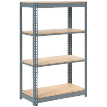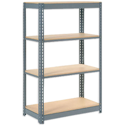 24"x48"x72" Heavy Duty, 4 Shelf Shelving Unit with Particle Board Deck, 1,500 lb load capacity per shelf, 14 gauge steel, No tools assembly, snap in place, adjustable at 1 ½" increments. Rubber Mallet provided with purchase. Color-Gray. For hand loading only, not to be used with forklifts.