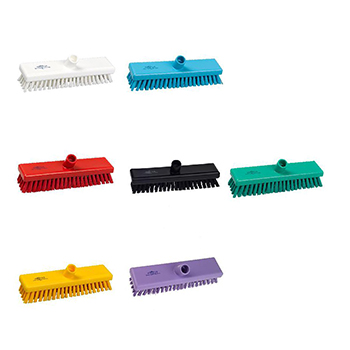 Compatible color coded handles. 12" scrub, polypropylene blocked, filled with very stiff Polyester Resin Set DRS (trademark). Ideal for uneven surfaces or smaller areas. The filaments will give more easily to reach dips, and there are more filaments to the square inch, allowing more intense cleaning.