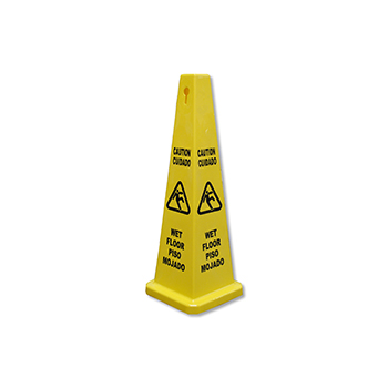 36.5” Yellow hard plastic 4 sided "Caution Wet Floor" bilingual cone. High visibility, demands attention to warn of potential hazard. Stackable. Durable construction with UV protection for exterior use. Helps reduce slip and fall injuries and liabilities. Features a slip hazard pictorial for exterior use near entrance, exits, outdoor sales areas, etc...